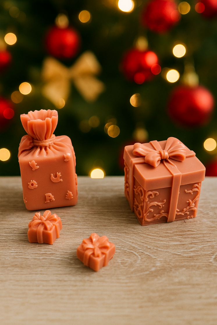 Add a touch of holiday warmth to your season with this adorable Christmas Gift Soap Set. The set includes two 1.5 oz soaps, each shaped like a festive gift (1.5 x 2 inches), infused with the sweet, spicy scent of freshly baked gingerbread. Alongside them are two smaller .75 oz gift-shaped soaps, offering the same irresistible gingerbread fragrance in a more compact size. Perfect for stocking stuffers, gift baskets, or simply spreading holiday cheer, these soaps bring a cozy, nostalgic aroma to your celebrations. A perfect blend of whimsy and holiday scent!